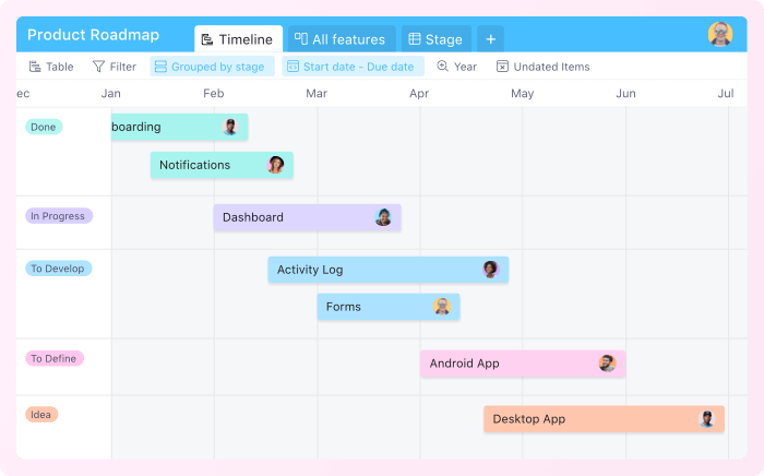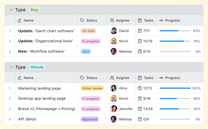 Use Columns, Calendar, Gantt, Table, and List views to visualize your data the way you want. Choose a different view for every folder, subfolder, and tab.